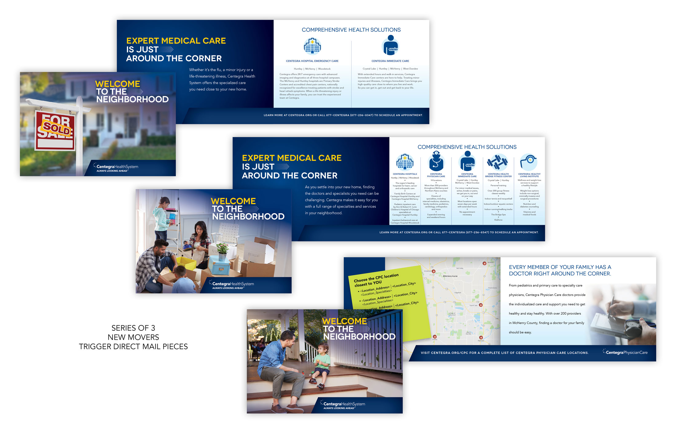 This series of three separate direct mailers targets new movers in the area. The initial mailer introduces the hospitals and immediate care centers within Centegra System. The second mailer outlines the variety of services available to local residents. The third mailer gives a list of the Centegra Physician Care locations closest to the addressee. I was tasked with layout and design of the mailers including image selection, icon creation and copy edits.