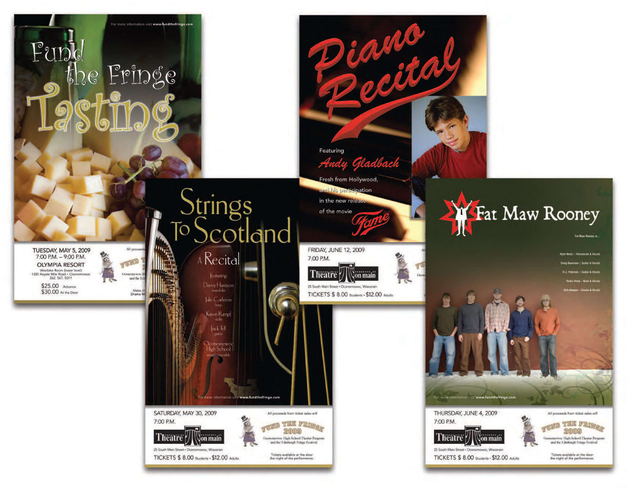 Series of posters for Oconomowoc (Wisconsin) High School theater program’s fundraising campaign to send the theater troop to Edinburgh, Scotland for the 2009 Fringe Festival. I was provided with the basic information about dates of the events. Image of Fat Maw Rooney and Andy Gladbach head shot were provided, but I created the visuals for the other posters based on the events.